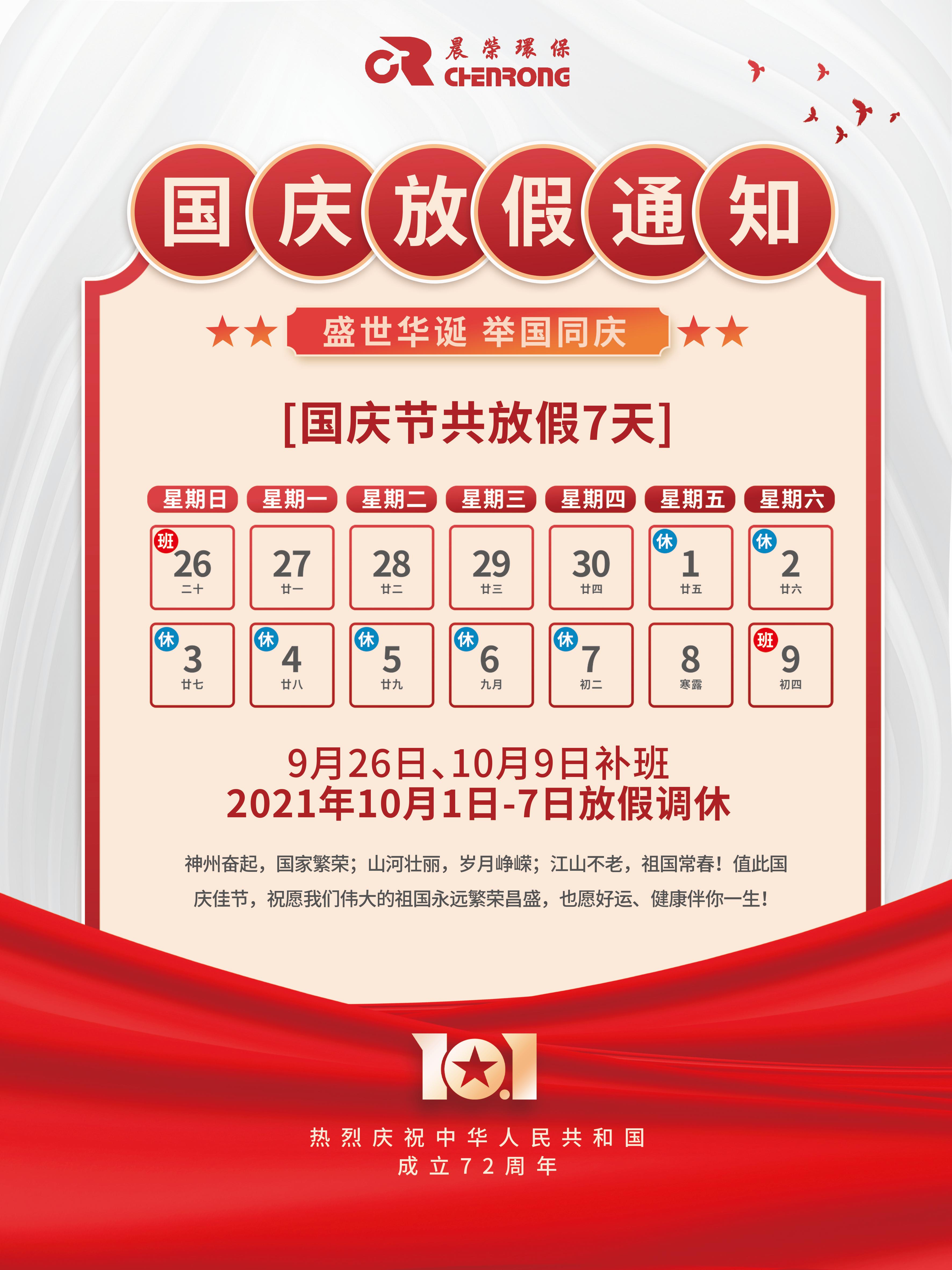 本司于2021年10月1日至7日国庆放假,共7天。在此期间依然接受询价和下单,晨荣环保全体员工提前祝大家假期快乐!