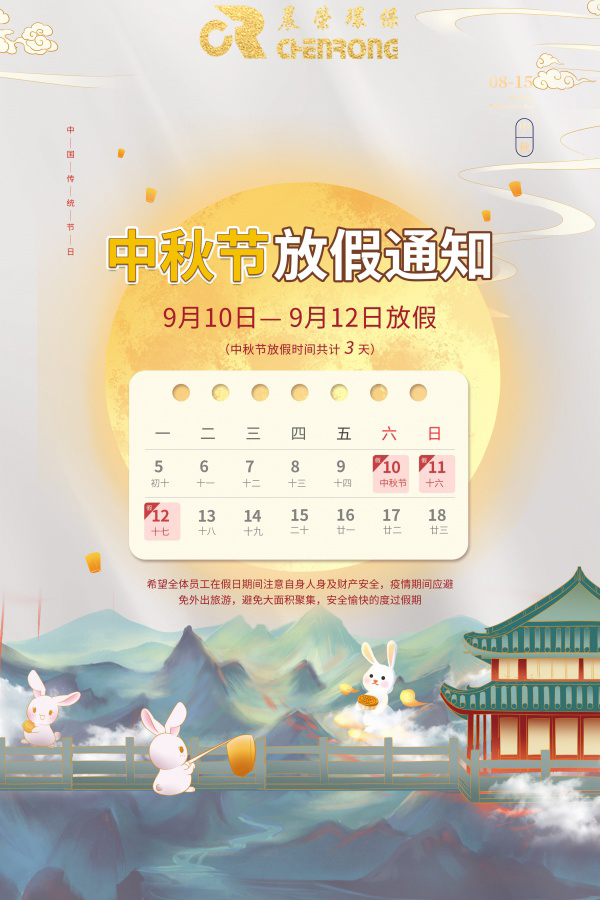 本公司于2022年9月10日到12日中秋节放假,共三天。在此期间依然接受询价和下单。中秋佳节,晨荣环保愿您阖家欢乐,幸福美满!月圆人圆事事圆,福事乐事好事不断,中秋节快乐!